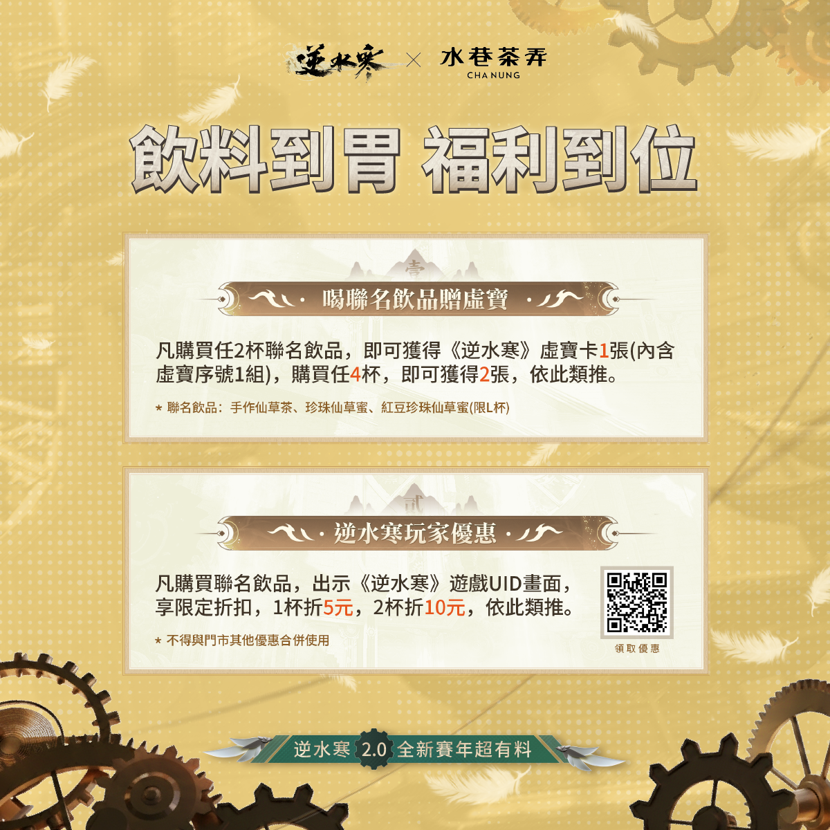 來店出示《逆水寒》遊戲UID畫面購買聯名飲品,即可享每杯-5元折扣‼